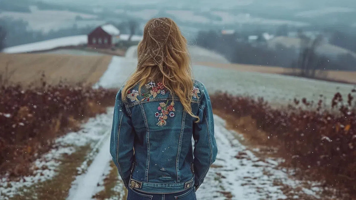 Woman in detailed embroidered denim jacket, Pennsylvania countryside background. Late Winter  season.