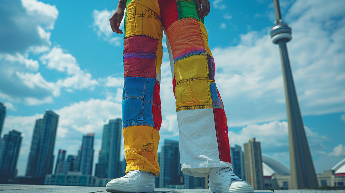 Model in colorful patchwork jeans, confident pose, highlighting denim's artistry. Spring season. White female. Christchurch city background.